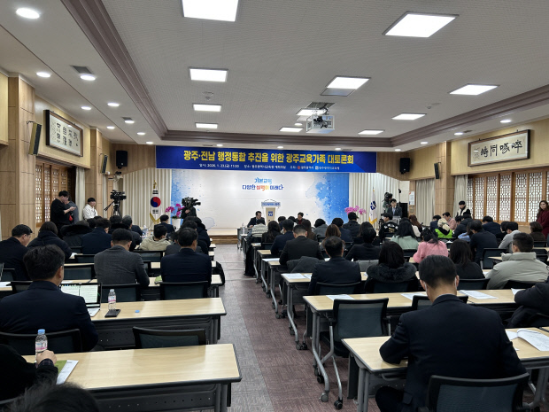 23일 광주전남 행정통합 추진을 위한 광주교육가족 대토론회가 광주시교육청 대회의실에서 열렸다. 강기정 광주시장, 이정선 교육감을 비롯해 학부모, 교원단체, 공무원 노조 등 100여명이 참석했다.