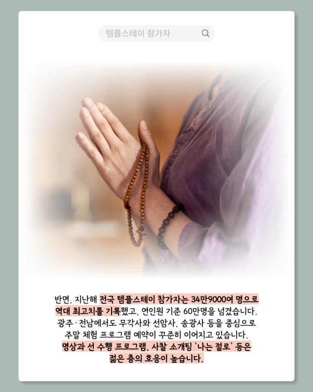 출가자의 감소 속 템플스테이 참가자는 전국 34만9000명으로 역대 최고치를 기록했다. 지역 사찰들은 사진 대회, 음식 체험, 어린이 캠프 등으로 불교와의 접점을 넓히고 있다.