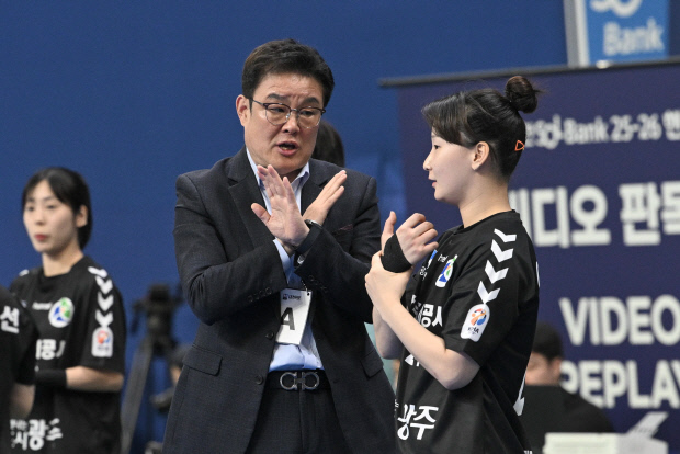 ![]() 광주도시공사 오세일 감독이 작전 타임 중 선수들에게 지시를 내리고 있다. <한국핸드볼연맹 제공> |