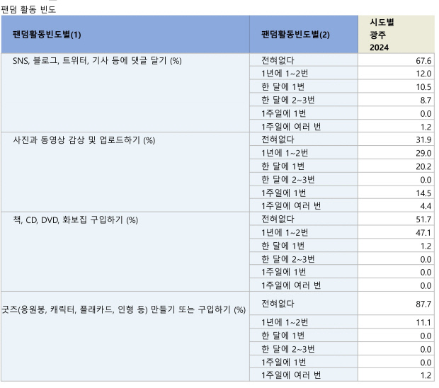 광주 청소년 10명 중 1명꼴(11.1%)은 1년에 한두 번 응원봉이나 캐릭터, 플래카드, 인형 등 관련 ‘굿즈’를 샀다. 일주일에 여러 번 샀다는 답변도 1.2% 비중을 차지했다.