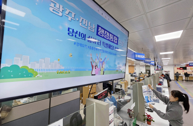 ![]() 광주·전남 행정통합이 급물살을 타고 있는 가운데 지난 23일 광주 북구청 민원실 모니터에 ‘광주·전남 행정통합으로 당신의 삶이 더 특별해집니다’란 홍보문구가 송출되고 있다. /나명주기자mjna@kwangju.co.kr |