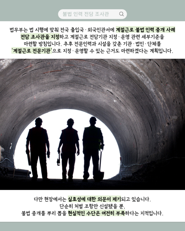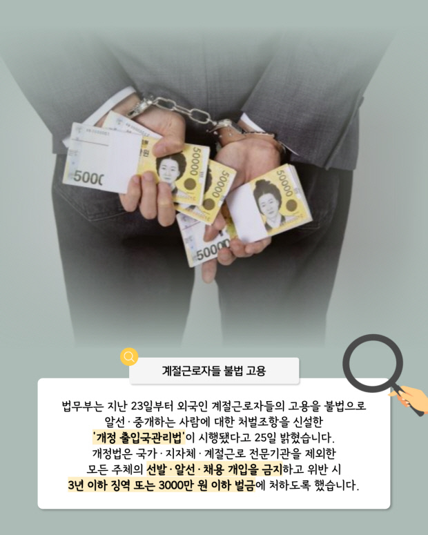 법무부는 ‘개정 출입국관리법’을 시행해 불법 알선·중개를 금지하고 위반 시 징역형이나 벌금을 부과하도록 했으나, 해외에서부터 금품 갈취 등을 당한 사례가 이어졌던 것으로 나타났다.