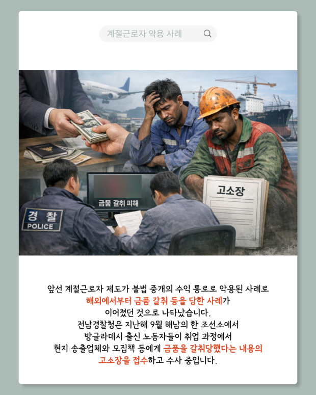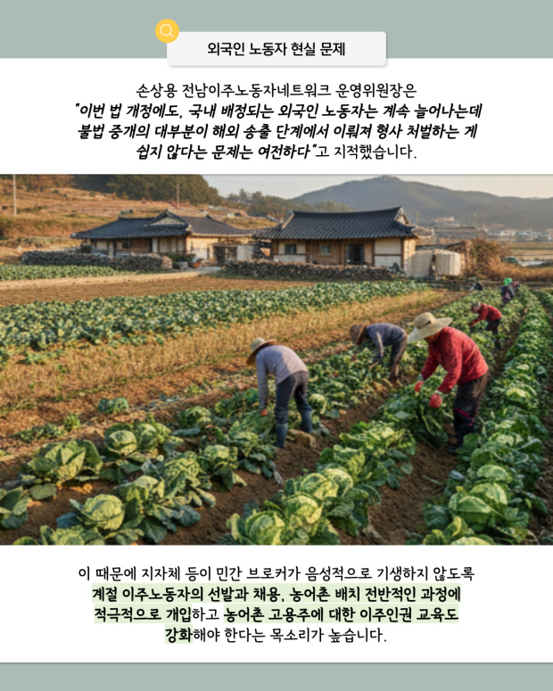 정부와 지자체가 올해 전남 2만1000여 명, 전국 10만여 명의 외국인 계절근로자를 배정했지만, 불법 브로커 문제는 여전히 심각하다.
