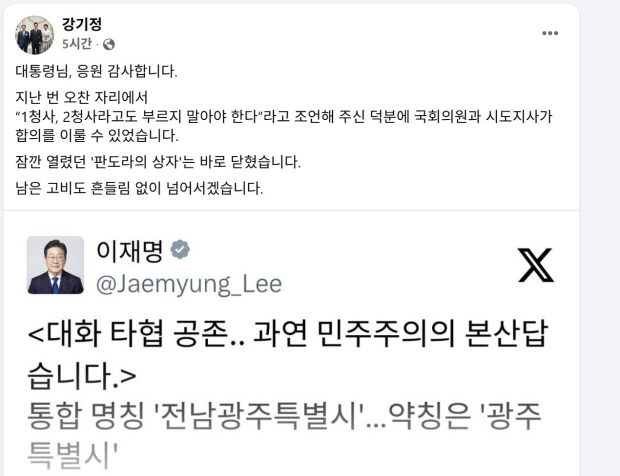 강 시장은 대통령의 글을 공유하며 “지난 오찬에서 대통령께서 ‘1청사나 2청사라는 수직적 명칭 대신 수평적 관계를 유지해야 한다’고 조언해 주신 덕분에 국회의원과 시도지사 간의 극적인 합의를 이끌어낼 수 있었다”고 밝혔다.