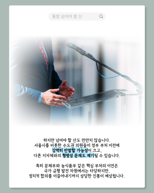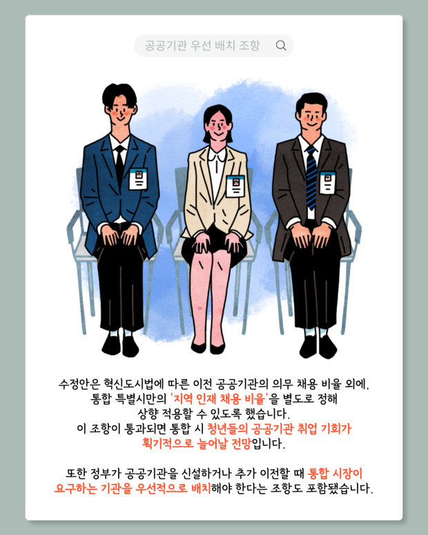 수정안은 법안 제395조에 중앙행정기관 이전을 의무화하고, 농협중앙회 본부 이전도 명시했다. 또 공공기관 지방 이전 시 통합특별시에 타 지역의 2배 이상 배정하도록 규정했다.