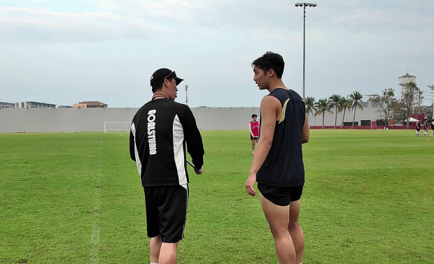 ![]() 광주FC의 장신 수비수 곽성훈이 태국 후아힌 캠프에서 이정규 감독(왼쪽)과 대화를 나누고 있다. |