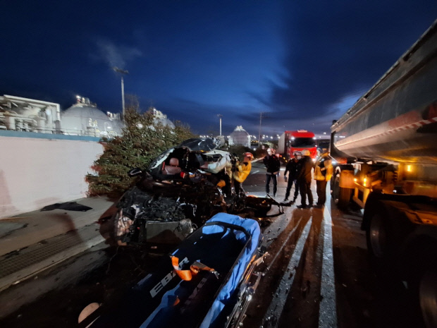 ![]() 30일 오전 6시30분께 여수시 월내동 여수국가산단 내 도로에서 50대 후반 남성 A씨가 몰던 SUV가 중앙선을 넘어 42인승 통근버스를 추돌했다. <전남소방본부 제공> |