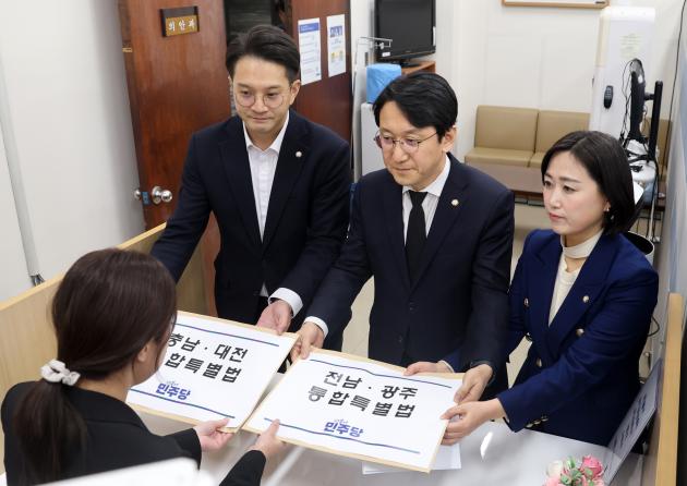 ![]() 더불어민주당 천준호(가운데) 원내운영수석부대표, 전용기(왼쪽) 원내소통수석부대표, 백승아 원내대변인이 지난 30일 국회 의안과에 전남광주통합특별법안과 충남대전통합특별법안을 제출하고 있다. <사진공동취재> |