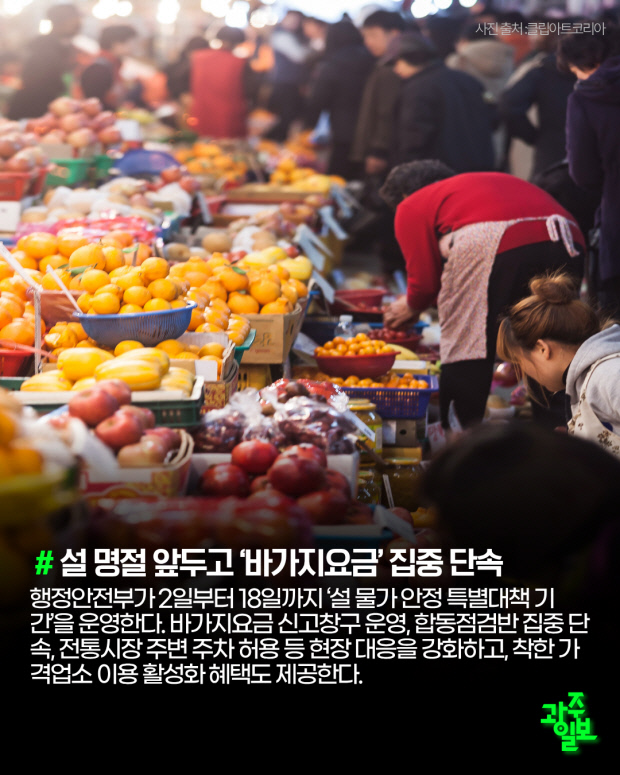 행정안전부가 2일부터 18일까지 ‘설 물가 안정 특별대책 기간’을 운영한다. 바가지요금 신고창구 운영, 합동점검반 집중 단속, 전통시장 주변 주차 허용 등 현장 대응을 강화하고, 착한 가격업소 이용 활성화 혜택도 제공한다.