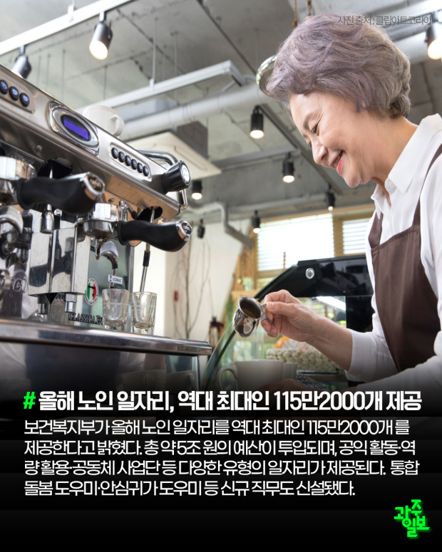 보건복지부가 올해 노인 일자리를 역대 최대인 115만2000개를 제공한다고 밝혔다. 총 약 5조 원의 예산이 투입되며, 공익 활동·역량 활용·공동체 사업단 등 다양한 유형의 일자리가 제공된다. 통합돌봄 도우미·안심귀가 도우미 등 신규 직무도 신설됐다.