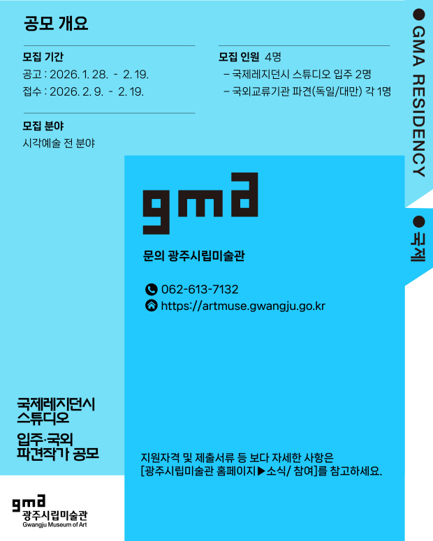 광주시립미술관(관장 윤익)은 2026 국제레지던시 스튜디오(입주·파견) 및 청년예술센터 입주예술인을 공모를 한다.