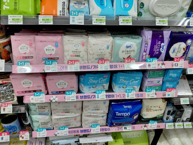 3일 광주 한 편의점에 덤을 주는 ‘1+1’ ‘2+1’ 할인 행사를 하는 생리대가 진열돼 있다.