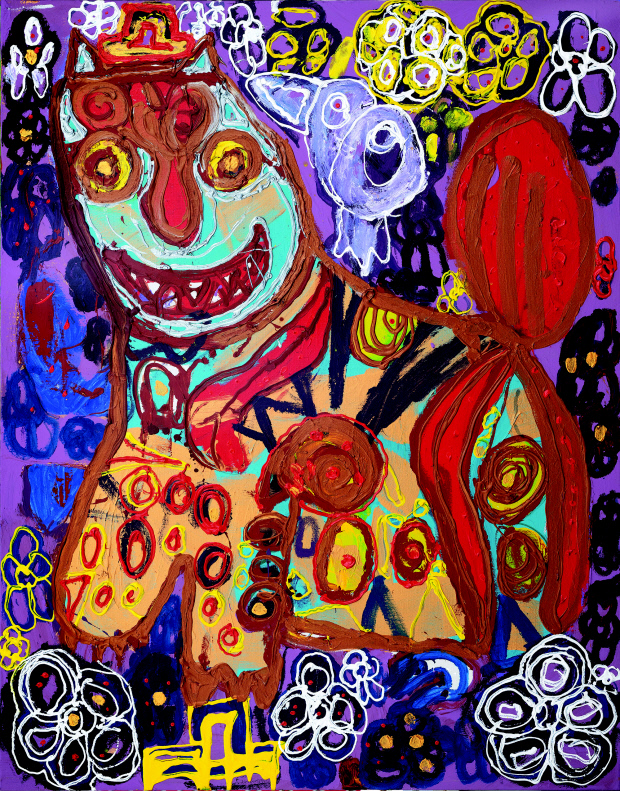 ‘Lovers’는 나란히 선 연인들의 모습을 초점화한 작품이다. 몸집에 비해 큰 얼굴과 커다란 이목구비는 편안하면서도 따스한 인상이다. 남자와 여자의 얼굴에는 오똑 솟은 코를 중심으로 두 마리의 새가 다정한 눈길을 건넨다. 사랑하는 두 연인의 마음을 새에 은유해 표현했는데 전체적인 몸짓이나 동작도 천진난만하다.