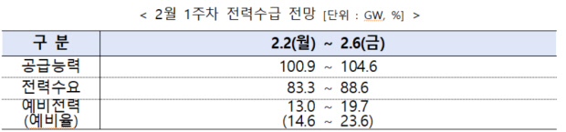 ![]() 2026년 2월 1주차 전력수급 전망 표.<한국전력거래소 제공> |