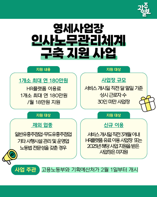 고용노동부가 선정한 13개 인사 관리(HR) 플랫폼에 전화 또는 이메일로 신청하면 최대 180만원(월 18만원)상당의 서비스를 지원받을 수 있다.