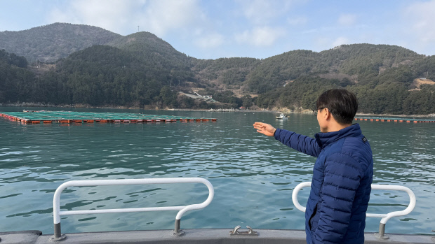 ![]() 10일 여수시 남면 장지 해역에서 여수시 관계자가 시범 월동장 내 가두리 양식시설을 가리키고 있다. |