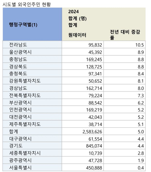전남 외국인주민 증가율은 전국 평균 증가율 5.0%의 2배에 달했고, 2023년에 이어 2년 연속 가장 높은 증가율을 기록했다.