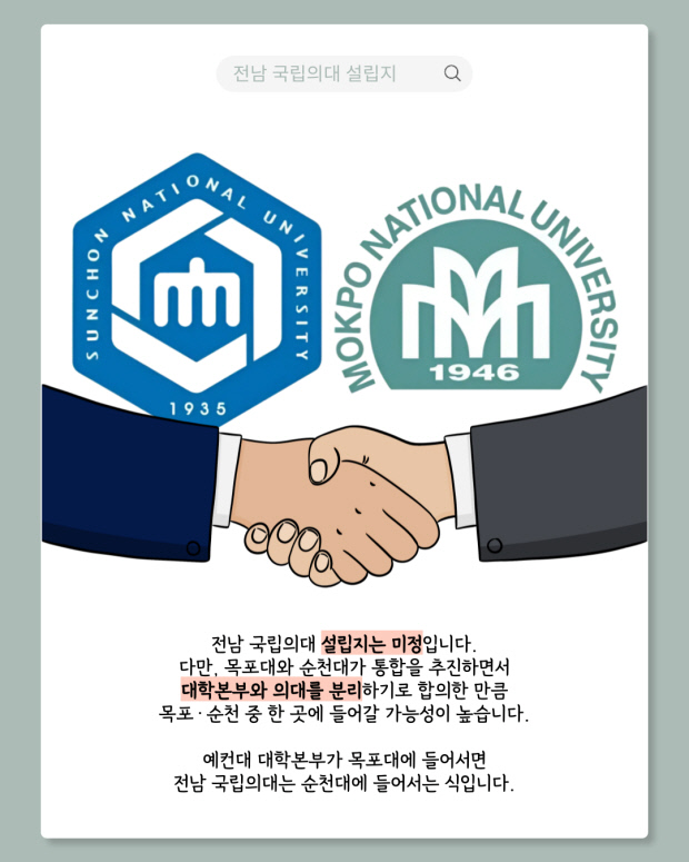 보건의료정책심의위원회는 지역·필수·공공의료 강화를 위해 2027년부터 2031년까지 전국 의대 정원을 단계적으로 확대하며, 2030년 이후 전남 국립의대 정원이 반영된다. 설립지는 미정이나 목포대·순천대 통합 추진에 따라 두 지역 중 한 곳에 들어설 가능성이 크다.
