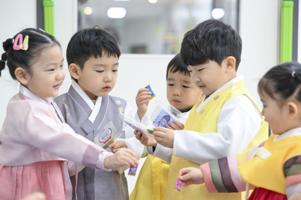 설 명절을 앞둔 12일 오전 광주 북구청어린이집에서 한복을 차려입은 어린이들이 전통 예절 교육을 마친 뒤 받은 세뱃돈 봉투와 사탕을 서로 비교하고 있다. /김진수 기자 jeans@kwangju.co.kr