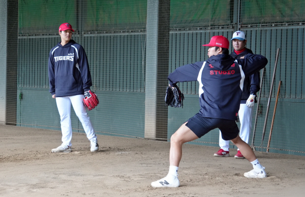 ![]() KIA 타이거즈의 김지용(오른쪽) 코치가 일본 아마미오시마 스프링캠프에서 이도현, 김태형과 엑스트라 훈련을 하고 있따. |