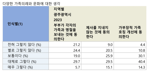 광주시민 절반 가까이(44.6%)는 제사를 지내지 않는 것에 동의하지 않고 있었다. 제사를 지내야 한다는 답변율은 29.5%에 그쳤다. 2020년 조사에서는 제사를 지내지 않는 것에 동의하는 비율은 40.5%로, 3년 새 같은 답변율이 4.1%포인트 늘었다.