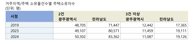18일 국가데이터처 주택소유통계에 따르면 2024년 기준 광주·전남 2건 이상 주택 소유자 수는 16만3877명으로, 전년(16만248명)보다 2.3%(3629명) 늘었다.