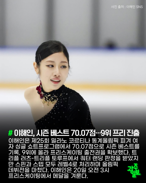 이해인은 제25회 밀라노 코르티나 동계올림픽 피겨 여자 싱글 쇼트프로그램에서 70.07점으로 시즌 베스트를 기록, 9위에 올라 프리스케이팅 출전권을 확보했다. 트리플 러츠-트리플 토루프에서 쿼터 랜딩 판정을 받았지만 스핀과 스텝 모두 레벨4로 처리하며 올림픽 데뷔전을 마쳤다. 이해인은 20일 오전 3시 프리스케이팅에서 메달을 겨룬다.