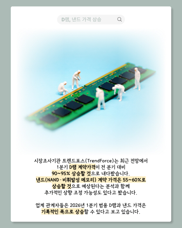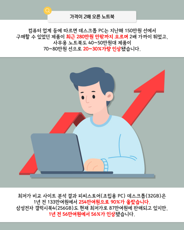 새 학기를 앞두고 메모리(RAM)와 SSD 등 핵심 부품 가격이 급등하면서 PC·노트북 가격이 크게 오르고 있다. AI 데이터센터 확대로 메모리 수요가 급증한 영향으로, 데스크톱과 노트북 가격이 1.5~2배 가까이 상승해 대학·대학원 입학생과 학부모들의 구매 부담이 커진 상황이다.