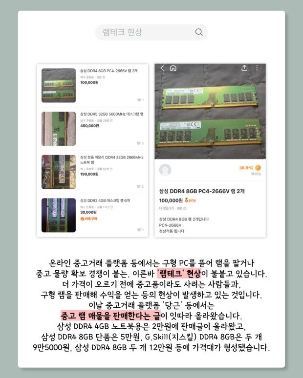 전자상가에서는 신제품 가격 급등으로 발길이 줄고, 메모리 업그레이드 비용 부담이 커지면서 저사양·구형 제품을 찾는 수요가 늘고 있다. 온라인 중고거래 시장에서는 중고 램을 사고파는 ‘램테크’ 현상도 나타나고 있다.