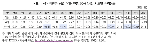 ![]() ■2024년 기준 청년 여성(20~34세) 시도별 순이동률 <단위:%·자료:한국여성정책연구원> |