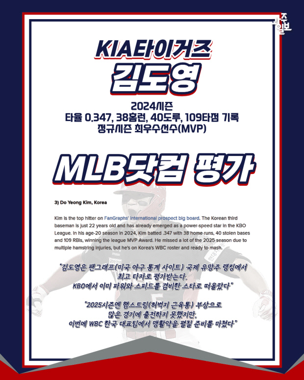 MLB닷컴은 KBO 2024 MVP에 빛나는 김도영은 ‘파워와 스피드를 겸비한 스타’로 평가 받았다. 지난해 햄스트링 부상에서 벗어나 WBC에서 활약할 준비를 끝냈다고 덧붙였다.