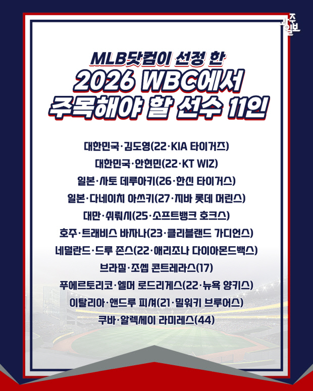 메이저리그 공식 홈페이지인 MLB 닷컴이 2026 월드베이스볼클래식(WBC)에서 주목한 11명의 선수를 선정했다. 한국을 대표하는 내야수 김도영과 외야수 안현민도 11명의 명단에 이름을 올렸다.