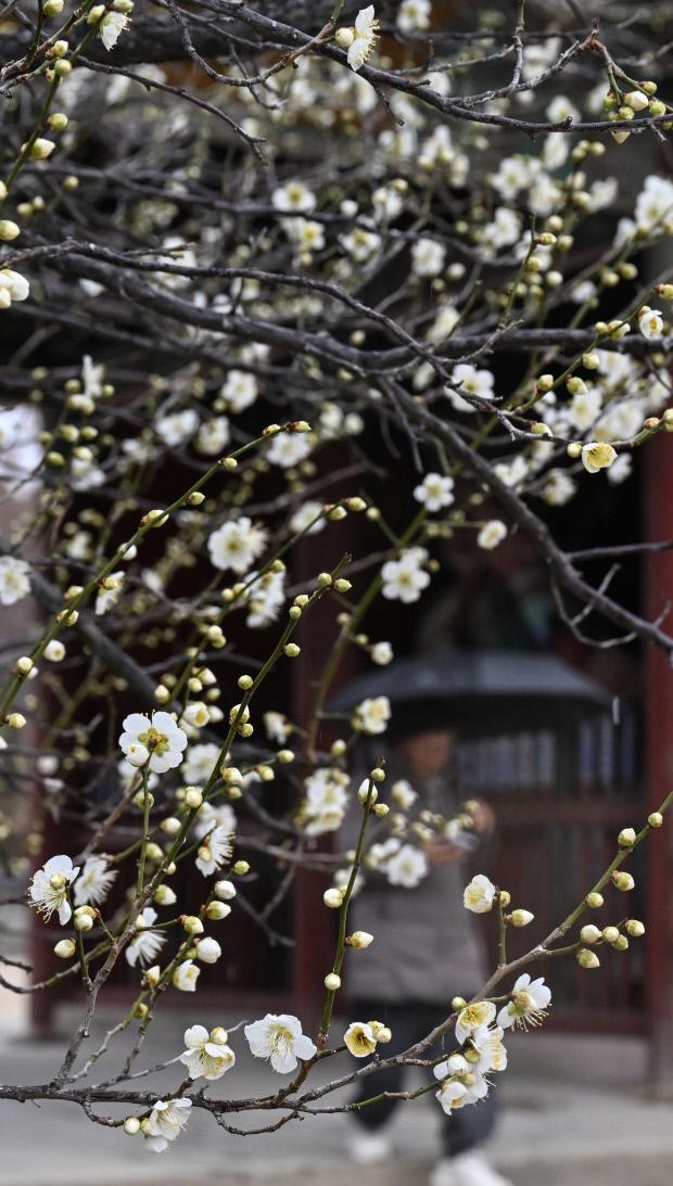 광주 전남에 비가 내린 24일 오전 광주시 서구 무각사에 매화가 꽃망울을 터뜨려 시민들의 눈길을 사로잡고 있다. /최현배 기자choi@kwangju.co.kr