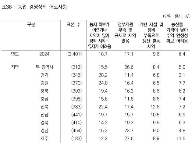 한국농어촌공사 ‘2024년 농지임차료실태조사’ 결과를 보면 전남 농지 임차인의 19.7%는 농업 애로사항으로 ‘농지 확보가 어렵거나 제약이 많아 경작 시작·유지가 어려움’을 꼽았다.