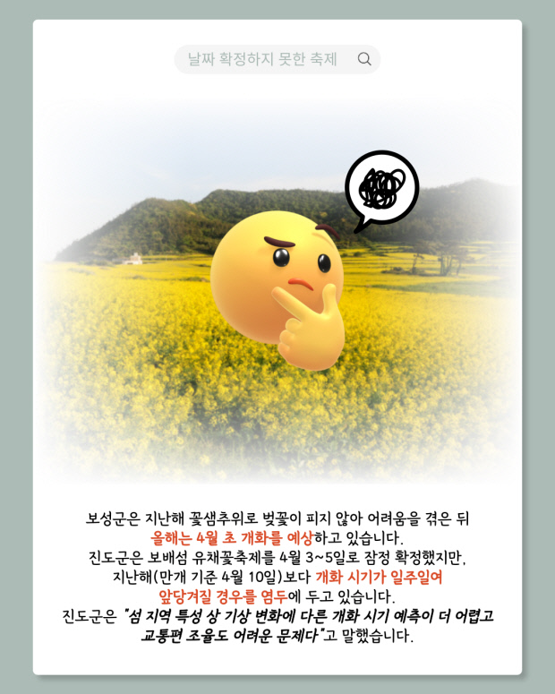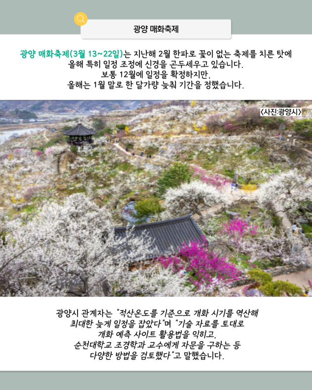 이에 광양시, 구례군, 여수시, 신안군 등은 개화 시기를 예측하며 축제 일정을 늦추거나 조정 중이다.