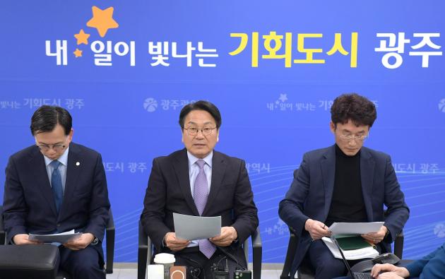 ![]() 강기정 광주시장이 26일 시청 기자실에서 무안국제공항 폐쇄 장기화에 따른 정부의 대책 마련을 요구하고 있다. <광주시 제공> |