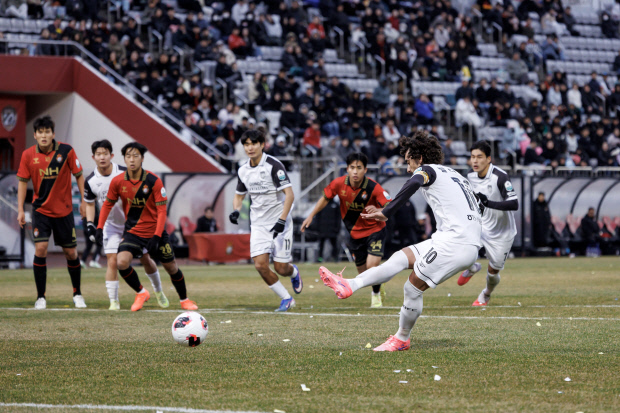 전남드래곤즈의 ‘주장’ 발디비아가 1일 경남FC와의 2026시즌 개막전에서 페널티킥을 시도하고 있다. 발디비아는 1골 2도움의 활약으로 4-1 승리의 주역이 됐다. <한국프로축구연맹 제공>