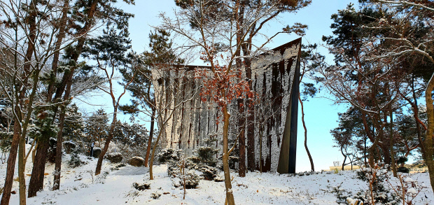 전주대학교 교정의 가장 조용한 언덕을 오르면, 시선이 멈추는 지점이 있다. 나무들 사이에서 녹슨 주홍빛의 조형이 뾰족하게 솟아 있는데, 이것이 김준영 전주대 건축학과 교수가 설계한 작은 예배당 ‘숲속 초막 셋’이다. 건물의 모습은 마치 숲이 스스로 마련해둔 제단처럼 보인다. 이 건축은 존재를 숨기지 않으면서도, 스스로를 과장하지 않는다. ‘숲속 초막 셋’은 김준영 교수가 화려함 대신 침묵을 선택해 만든, 아주 작은 규모의 기도 같은 공간이다.