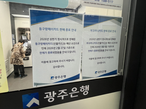 4일 광주시 동구 광주은행 동구청지점에 ‘동구랑페이’와 ‘부끄머니’ 판매 종료 안내문이 부착돼 있다.
