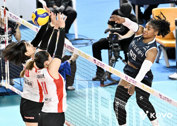 ![]() 지난 4일 김천체육관에서 열린 진에어 2025-2026 V리그 여자부 6라운드 한국도로공사전에서 AI페퍼스가 모마(오른쪽)의 공격을 블로킹하고 있다. <KOVO 제공> |