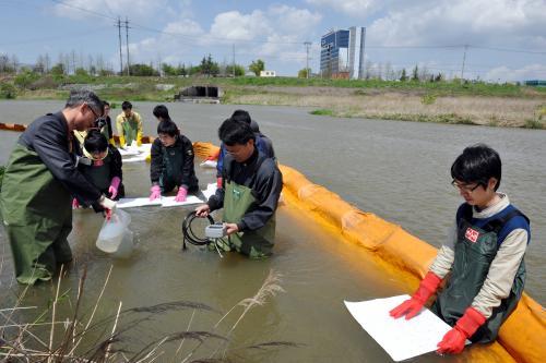 27일 오전 광주 북구 용두동 용두교 아래에서 열린 ‘2010 상반기 수질오염 가상 방제훈련’에서 광주시청, 광주보건환경연구원 및 5개구청 수질보전과 직원들이 오염물질 제거 작업을 하고 있다.