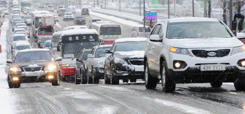 8일 오후 낮 최고기온이 영하권에 머무는 맹추위 속에 갑작스러운 폭설이 내리자 도로 곳곳이 얼어붙었다. 광주시 북구 운암동 동운고가를 지나는 차량들이 거북이 운행을 하고 있다.