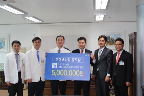 3일 현대백화점 광주점(점장 이채식·사진 오른쪽 세번째)이 조선대학교병원(병원장 민영돈) 신관 4층 병원장실에서 신생아의 생존율을 높일 수 있도록 신생아 집중치료센터 의료 환경개선을 위한 후원금 500만원을 전달했다.
