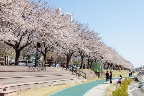 광양시 서천변 3km 구간 연분홍빛 벚꽃길이 생태하천과 어우러져 장관을 연출하면서 상춘객들의 발길이 이어지고 있다.