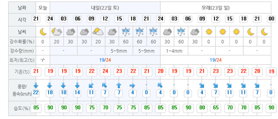 서울, 경기, 강원은 22일 구름이 많을 것으로 전망되며, 충청과 남부지방은 흐리고 충청 남부와 전라도, 경남 서부는 오전 9시부터 가끔 비가 오는 곳이 있을 것으로 보입니다.