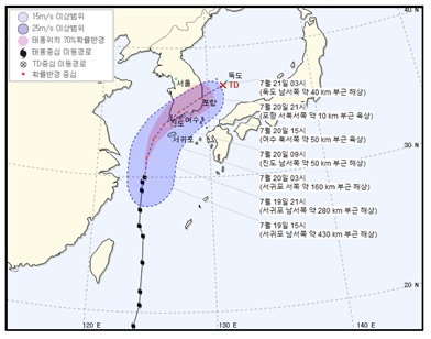 다나스는 제주도 서쪽 해상을 지나 20일 한반도에 상륙해 21일에 동해상에서 열대저압부로 약화해 소멸할 것으로 예상됩니다.