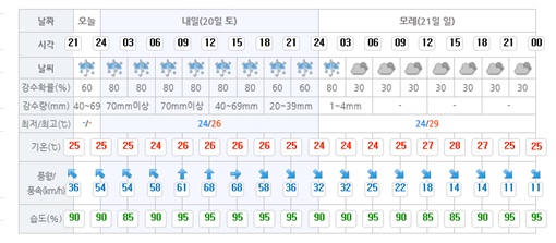 21일 오전까지 예상 강수량은 남해안, 지리산 부근, 제주도가 100~250mm 정도로 예상되고 많이 오는 곳은 500mm 이상 오는 곳도 있겠으니 유의하셔야겠습니다.